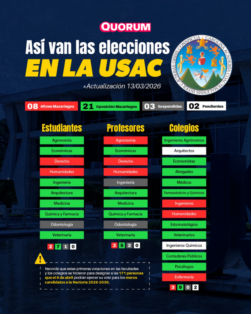 Durante estos años, estudiantes, docentes y profesionales se han organizado para la recuperación de la universidad. Este esfuerzo no fue en vano, tras mucha organización y dedicación, lograron 21 cuerpos electorales de oposición a Mazariegos para la elección, Quorum nos ayuda a visualizarlo mejor, aquí: